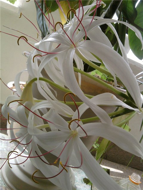 Amaryllis family. Homeland - South Africa. There are about 100 species in nature. Crinum is a chic flowering plant more suitable for growing in greenhouses and winter gardens than in apartments. Not only because plants reach huge sizes, the main reason is the need for cold wintering. They usually bloom in July - September. During the dormant period, most species of crinum do not lose leaves (one to two leaves may turn yellow) and do not tolerate leaf pruning.