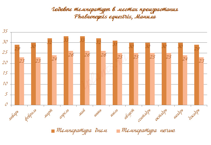 Let's compare the two species widely used in breeding, according to the conditions of their habitat in nature. Phalaenopsis pleasant Phalaenopsis amabilis (climate in the South of Java) and Phalaenopsis rider Phalaenopsis equestris (climate Manila, Philippines). For us, everything seems to be the same - both grow somewhere in the south, where it is warm, on the ocean, but take a closer look: