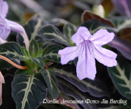 - Ruellia Devo Ruellia devosiana is a herbaceous perennial plant about 40 cm tall. Stem with grayish pubescence, leaves up to 7 cm long, elliptical, velvety, dark green on the upper side, light along the veins, purple on the underside. Flowers up to 2 cm in diameter, single, axillary. Corolla limb pale lilac or white.