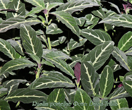 - Ruellia portella Ruellia portellae is a herbaceous perennial plant about 50-60 cm tall. Stem with grayish pubescence, leaves up to 8 cm long, oblong, velvety, dark green on the upper side, light along the veins, purple on the underside. Flowers up to 2.5 cm in diameter, single, axillary. The corolla limb is bright pink.