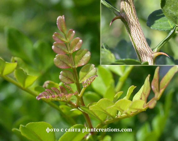 - Zantoxylum americanus Zanthoxylum americanum is the birthplace of the United States. Branching shrub up to 6 m in height. The bark of the trunks is brown, with sharp spines. The shoots are long, drooping. The leaves are pinnate, with opposite segments - leaflets, up to 11 in number. Each leaflet is dark green in color, spineless, oval in shape, pointed at the end. The leaves are dense, slightly bent along the central vein, with an even or serrated edge. The fruit is red about 5 mm in diameter.
